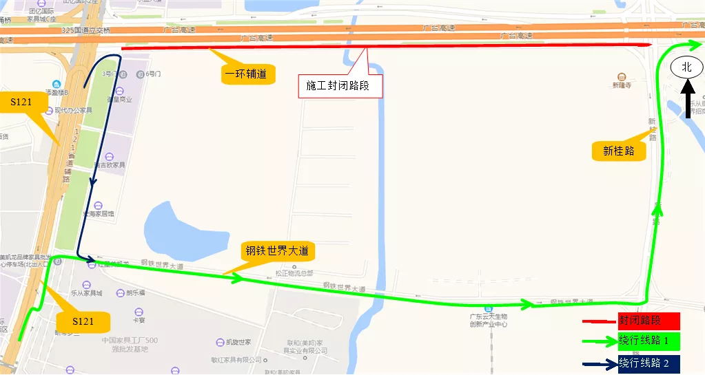 施工单位建议通过以下绕行线路绕行:(1)S121→钢铁世界大道→新桂路→一环辅道;(2)S121→商业区道路→钢铁世界大道→新桂路→一环辅道。