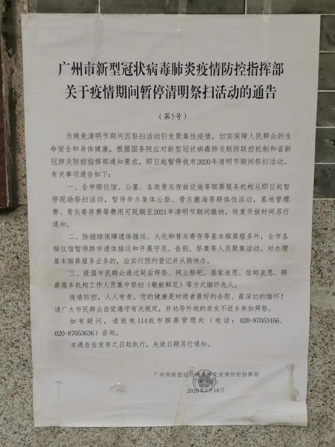 广州市民政局呼吁市民待疫情解除后再前往拜祭场所开展祭扫活动,祭扫场所重新开放后可即时满足市民祭扫需求。