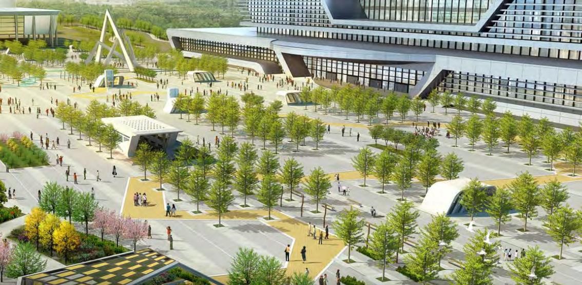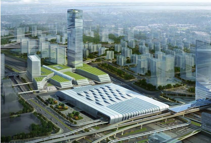 枢纽配套场站工程。枢纽配套场站工程规模总计 9.5 万平方米,占地面积 7.02 公顷。主要包括西侧交通广场、北广场地面景观绿化、北广场地下空间、枢纽综合管理中心等四项建设内容。