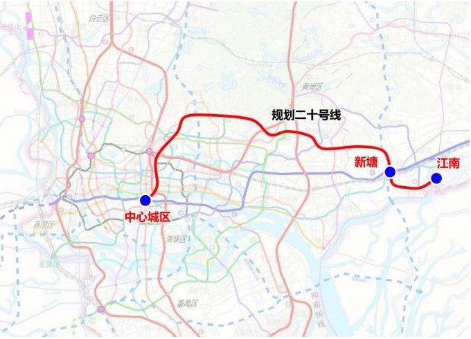 二十号线起于广州中心城区,作为中心城区的加密线,串联了海珠、天河、黄埔和增城四大组团,经新塘后止于江南,加强天河、黄埔组团与新塘站的联系。