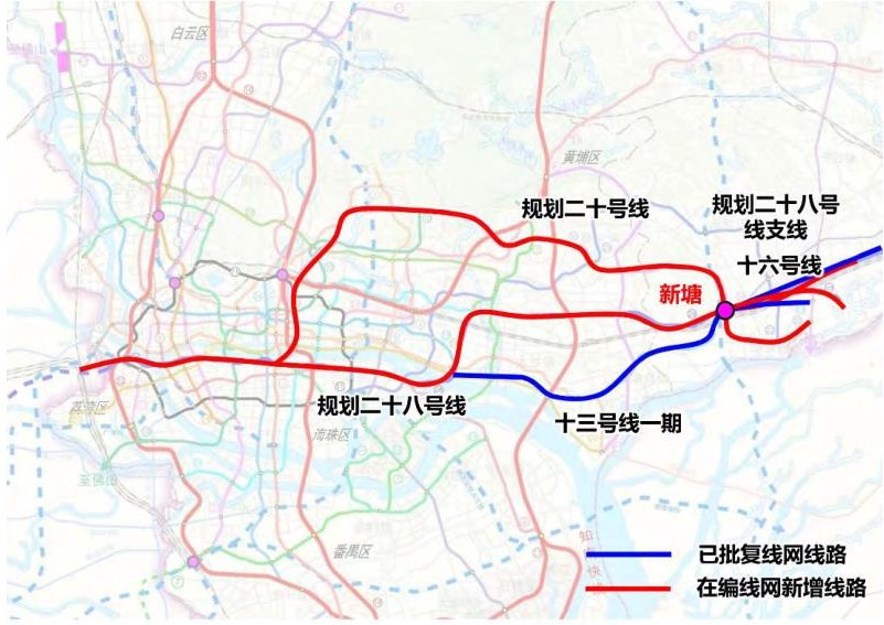 与广州火车站、广州东站相比,新塘站仅与十三号线及十六号线两条轨道交通接驳,轨道交通服务水平偏低,因此在最新一轮的线网修编中,针对新塘综合交通枢纽的定位和功能,增加3条规划线路,分别是规划二十号线、规划二十八号线以及二十八号线支线。