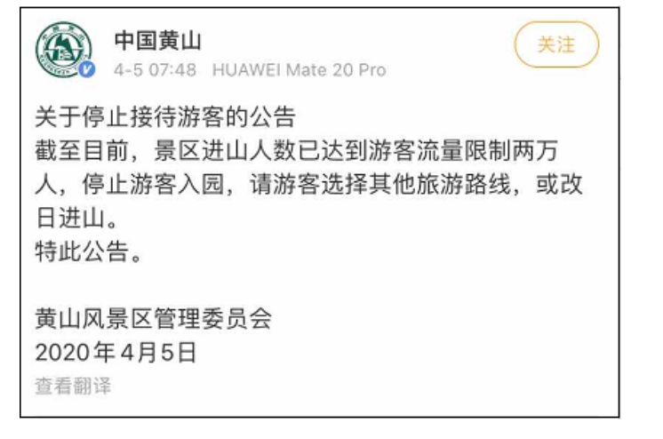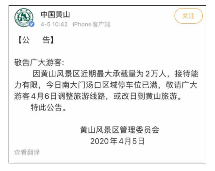 4月5日上午7时48分,安徽省黄山风景区管理委员会官方微博@中国黄山 发布公告,全文如下: