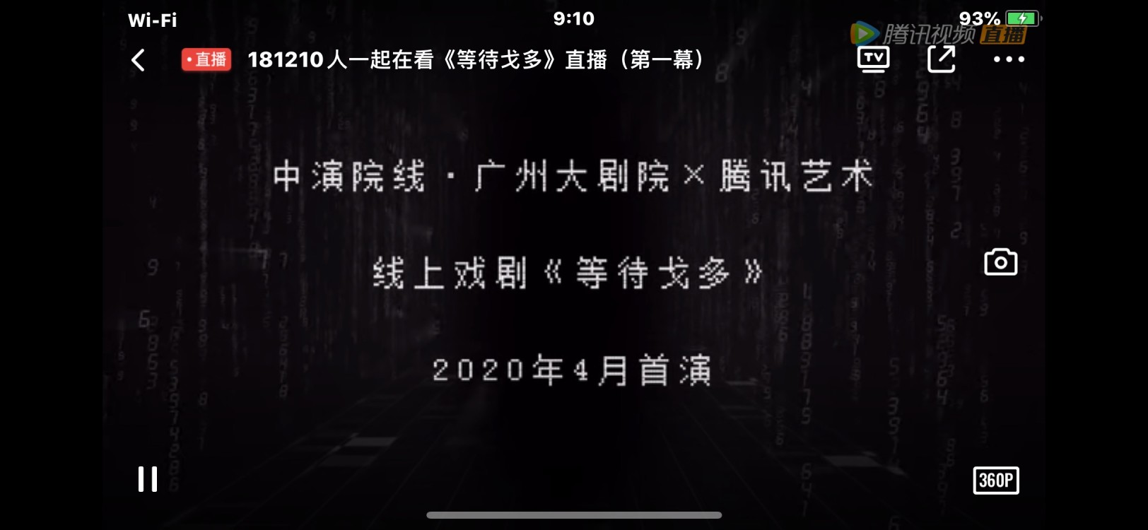 4月5日晚,“中演院线·广州大剧院X腾讯艺术:线上戏剧《等待戈多》公益演出”完成了它的第一幕首演亮相。该剧由新浪潮戏剧导演王翀执导,演出第一幕便吸引了超过18万观众同时在线观看,创下了中国话剧最多单场观演人数的纪录。演出第二幕将于4月6日晚8时于腾讯视频艺术频道直播。