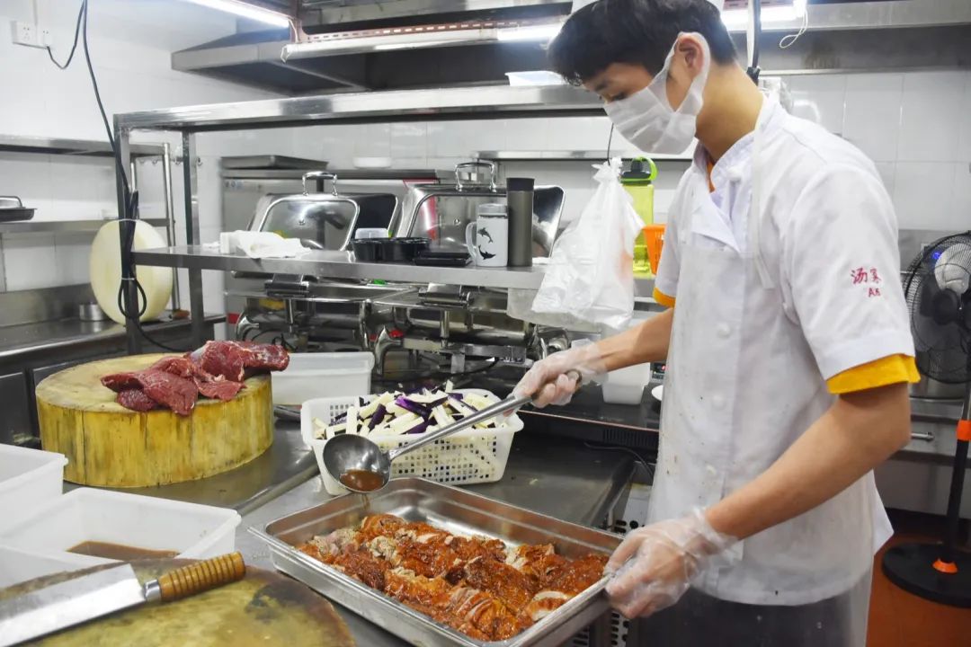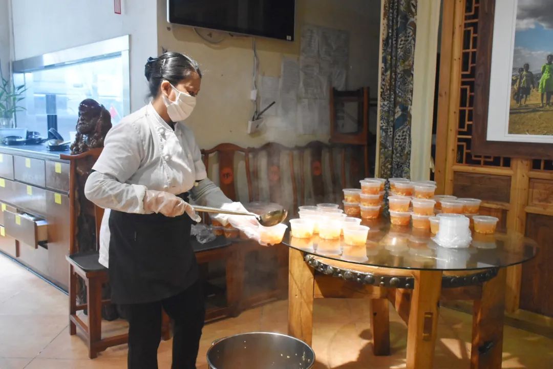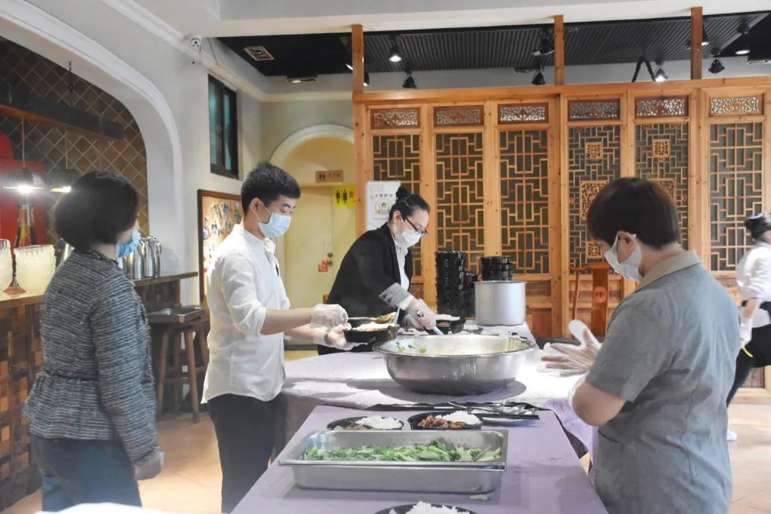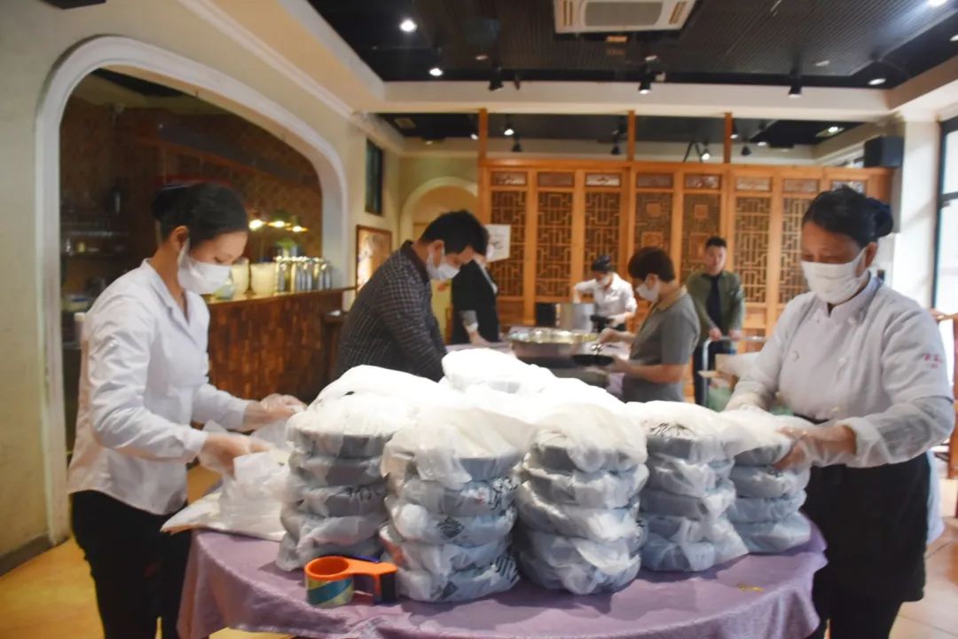 汤家味悦餐厅的工作人员在早上6点钟左右开始买菜,厨房师傅们8点上班,比平时提前一个小时做准备,11点左右开始打包,11点半送到酒店,每天不重样的精心准备,受到住客一致好评。
