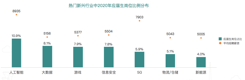 与此同时,2020年春招季,战略新兴行业中面向应届生的岗位规模较去年同期普遍有1-5个百分点的提高,应届生岗位占比也高于全行业均值。数字经济和先进制造业相关的产业在疫情中发挥了重大价值,随着生产生活秩序逐步恢复,“新基建”热度提升,人工智能、工业互联网、物联网、商用5G等领域成为关注的核心,这些新兴行业对应届生也较为友好。