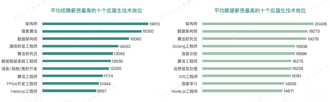 数据显示,2020年应届生岗位的平均招聘薪资为5838元,较2019年同期增长4.1%。与此同时,2020年应届生的薪资期望居高不下,平均期望薪资高达6139元,较2019年增长16.3%,近九成技术类岗位的招聘薪资低于学生期望。