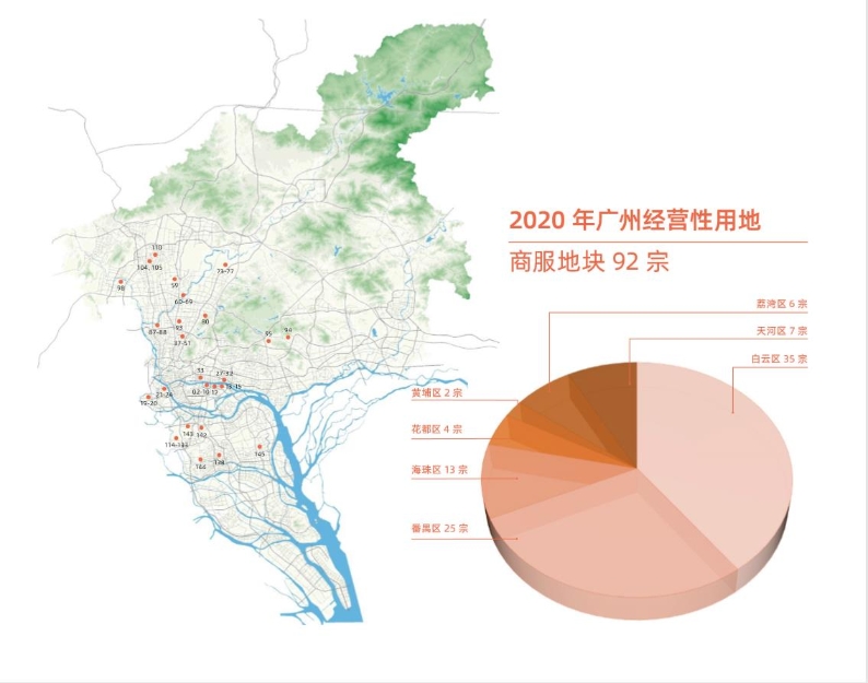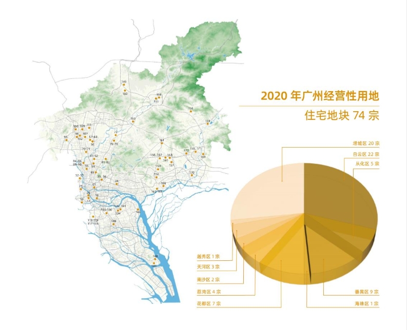 依据保障城乡发展、产业用地有序有效供给和房地产用地持续稳定供应的原则,广州市规划和自然资源局节选了2020年广州建设用地供应计划中部分经营性用地,编制了《2020年广州经营性用地供地蓝皮书》。本次蓝皮书中共收录173宗土地,其中住宅用地74宗(449.2公顷),增城区20宗、白云区22宗、从化区5宗、番禺区9宗、花都区7宗、天河区3宗、荔湾区4宗、南沙区2宗、越秀区1宗、海珠区1宗,主要分布在白云、番禺、花都、增城等区域;商服地块92宗(153公顷),荔湾区6宗、天河区7宗、白云区35宗、黄埔区2宗、花都区4宗、海珠区13宗、番禺区25宗,主要分布在金融城起步区、琶洲互联网创新集聚区、白云新城商务区、番禺南站片区等区域;其他地块7宗(44.2公顷),番禺区1宗、海珠区1宗、花都区5宗。