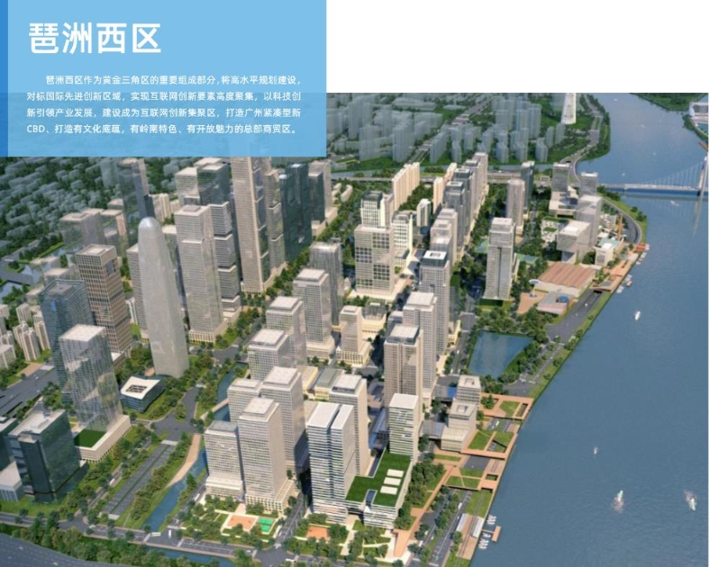 琶洲西区作为广州黄金三角区的重要组成部分,将高水平规划建设,对标国际先进创新区域,实现互联网创新要素高度聚集,以科技创新引领产业发展,建设成为互联网创新集聚区,打造广州紧凑型新CBD、打造有文化底蕴,有岭南特色、有开放魅力的总部商贸区。琶洲西区将结合配套商业,从而创建一个多功能的地区供人们生活、工作、学 习。规划配套完善、多元活力的地下功能布局,打造自然舒适、立体丰富的地下空间环境和成熟先进、设施完备的市政及防灾体系。