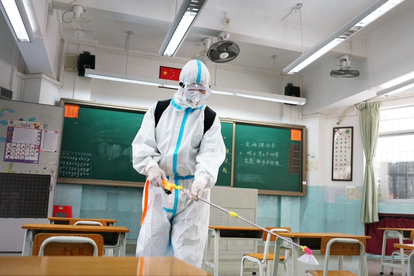 随后,模拟的学校防疫消毒保障人员开展空气喷雾消毒、物表消毒、紫外线灯照射消毒,确保校园课室内外的环境卫生清洁。