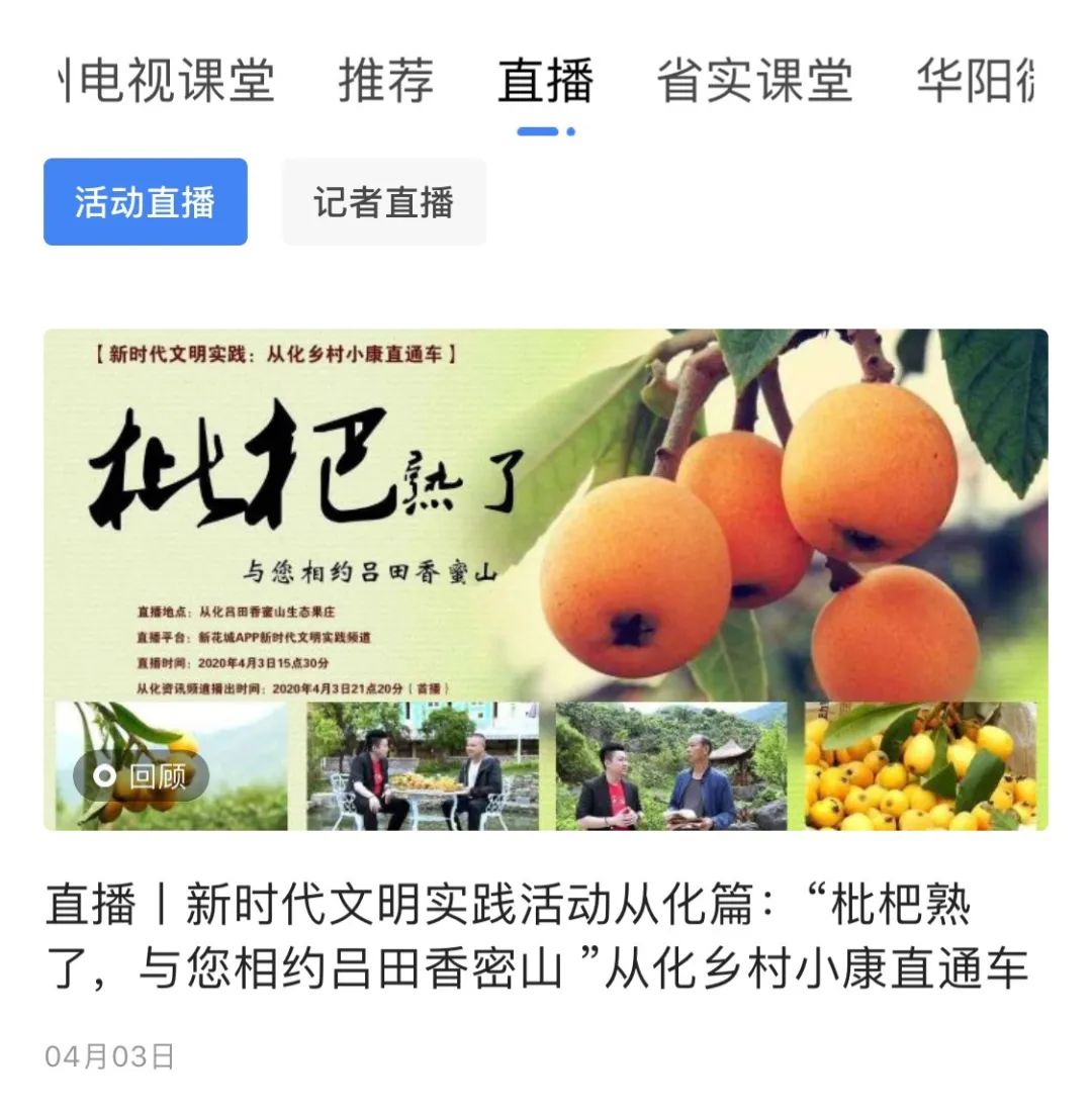 ▲新时代文明实践活动:“枇杷熟了,与您相约吕田香蜜山” 从化乡村小康直通车节目,通过“新花城”APP同步直播。