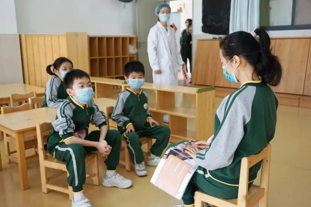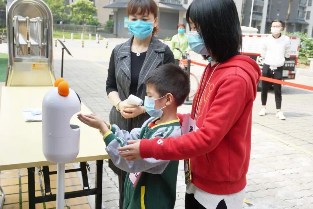 在入园环节中,幼儿(参与演练人员扮演)分批、间隔1米以上距离有序进行体温监测,体温正常的“幼儿”、“幼儿家长“、教职工进行手部消毒后可进入校园。随后,“幼儿”在家长的帮助下,更换上由学校统一准备的清洁口罩,并在大堂由保健医生再次晨检后进入班级。