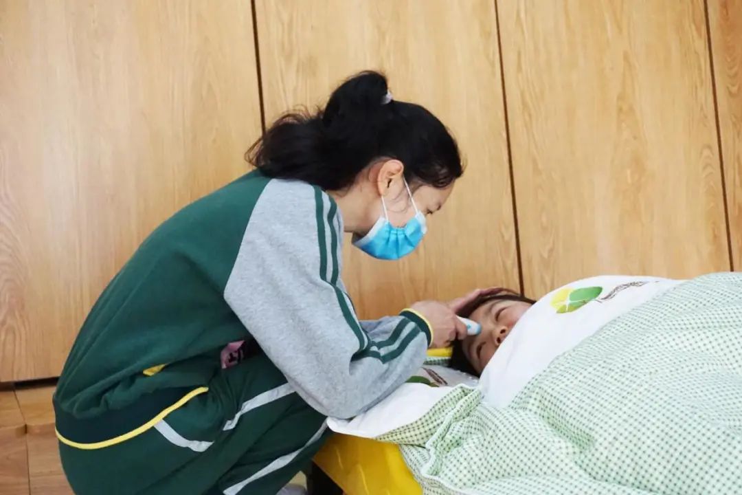 在室内活动、室外活动、午睡的模拟情景中,老师发现“幼儿”有精神萎靡、咳嗽、头痛等症状时,立即停下活动,用体温枪给该“幼儿”测温。发现体温超过37.3度时,上课老师第一时间将情况上报保健医生、园长。