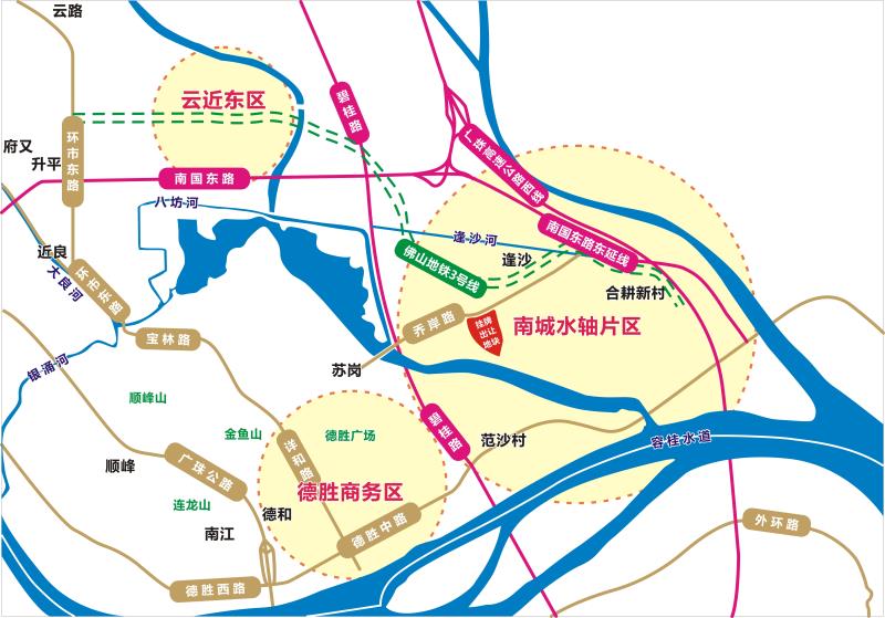 南城水轴片区地处南国路以南、碧桂路以东、德胜河以北、李家沙水道以西,紧挨云近东区及德胜商务区,总面积约11.24平方公里。为充分发挥其大良容桂交汇要塞,及广州南沙自贸区对岸的区位优势,政府多次调研布局其交通网络。