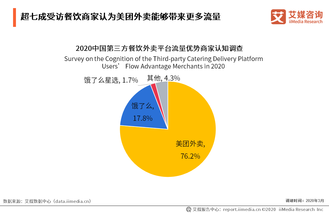 4月12日,第三方数据机构艾媒咨询发布《2020疫情期间中国餐饮外卖市场商户专题研究报告》(以下简称“报告”),报告显示,美团外卖成为餐饮商户最满意的外卖平台,综合评分达到82.1(满分100),饿了么评分为74.6。此外,超七成受访餐饮商家认为美团外卖能够带来更多流量,更认可美团外卖在疫情期间帮扶举措。