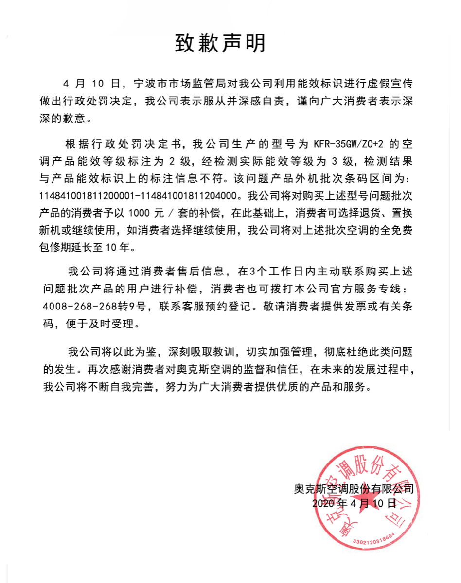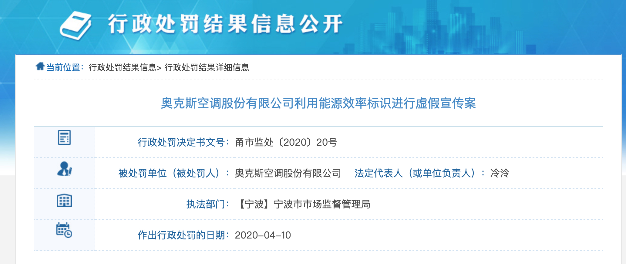 由此,宁波市市场监督管理局对奥克斯空调作出责令改正并处罚款十万元,行政处罚履行期限为2020年4月25日。