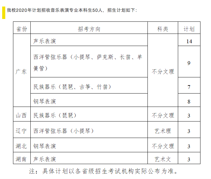 4月12日,中山大学对外公布,该校2020年首次招收音乐表演专业本科生,计划招收50人。音乐表演专业录取时使用考生专业省级统考成绩,中山大学不举行校考。