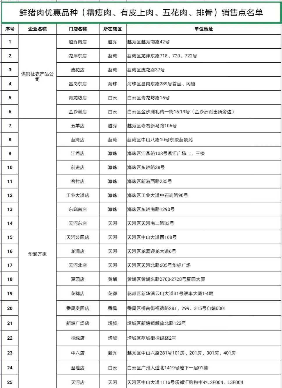 4月3日至5月2日,广州市开展为期30天的鲜猪肉价格调控,以优惠价格销售精瘦肉、有皮上肉、五花肉、排骨等4个猪肉品种,华润万家、胜佳、西亚兴安、澳之星超市等82家门店参与优惠。
