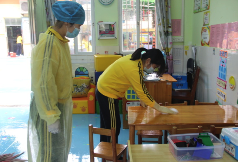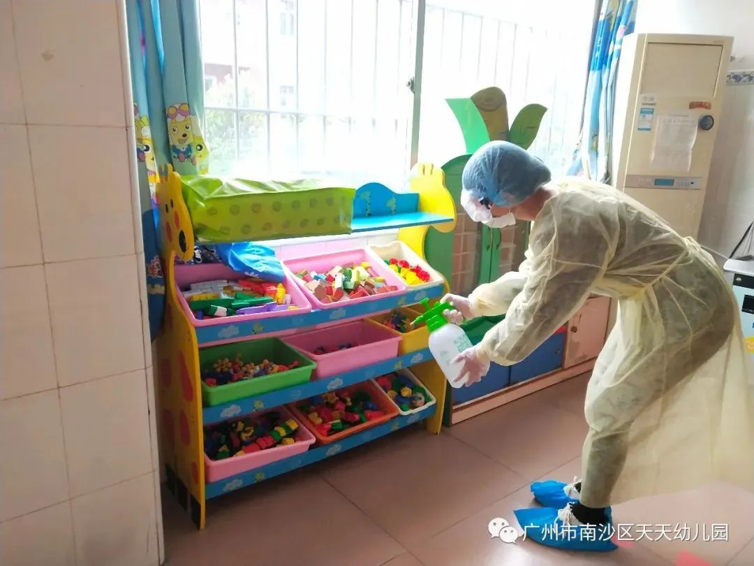 保健医生指导教职工对全园进行彻底消毒清洁。