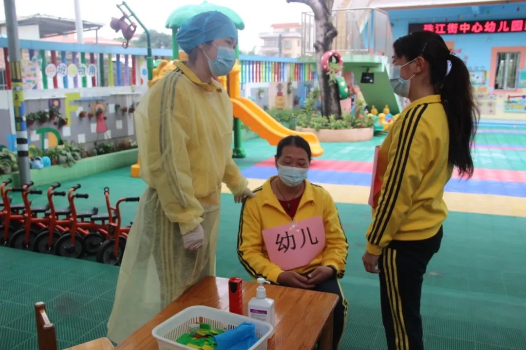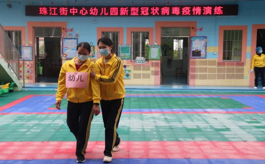 4月7日上午9时,珠江街中心幼儿园举办了防控新冠肺炎疫情应急演练。教职工们扮演家长、幼儿,在班主任、保安和保健老师的带领下,有序完成了从晨检进入校园、排队进入课室过程中模拟突发疑似病例并正确处置的演练情景。