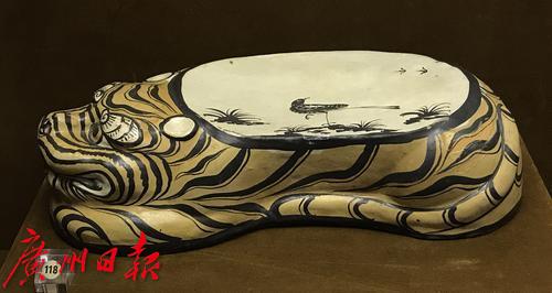 记者注意到,这批陶瓷枕中,仅涉及老虎题材可见姿态万千:或匍匐在地,缩颈抬头;或两眼圆睁,眉骨隆起。每一只都身躯肥硕,结实有力,栩栩如生。