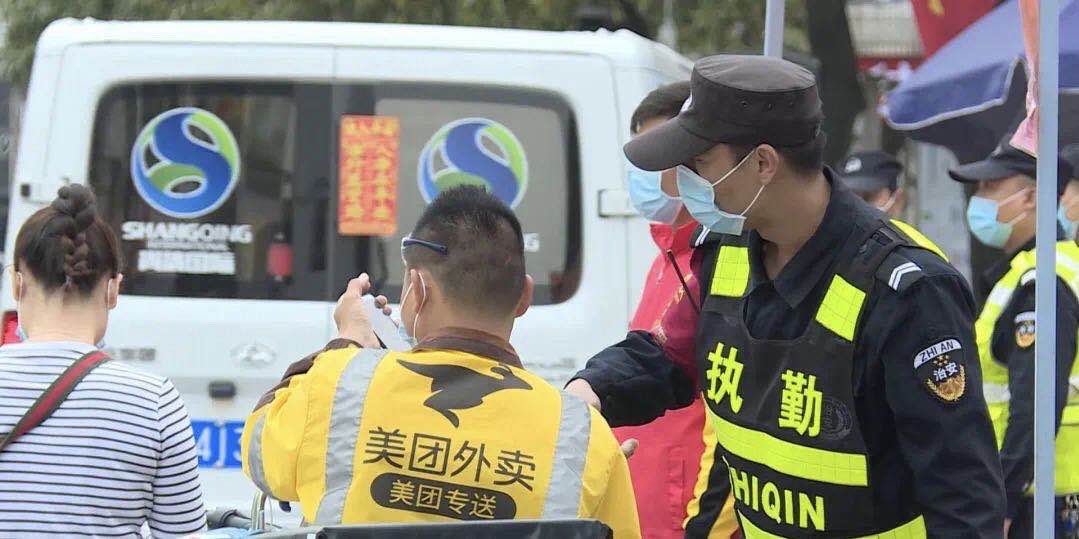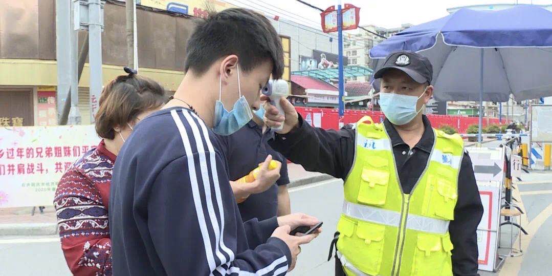 4月13日下午3点,庆丰社区巡逻队队长周勇带着一部分队员到社区防疫卡口换班,继续对进村的人员进行测温、近期行程查验等工作,另一部分队员则到社区的大街小巷进行日常巡逻。