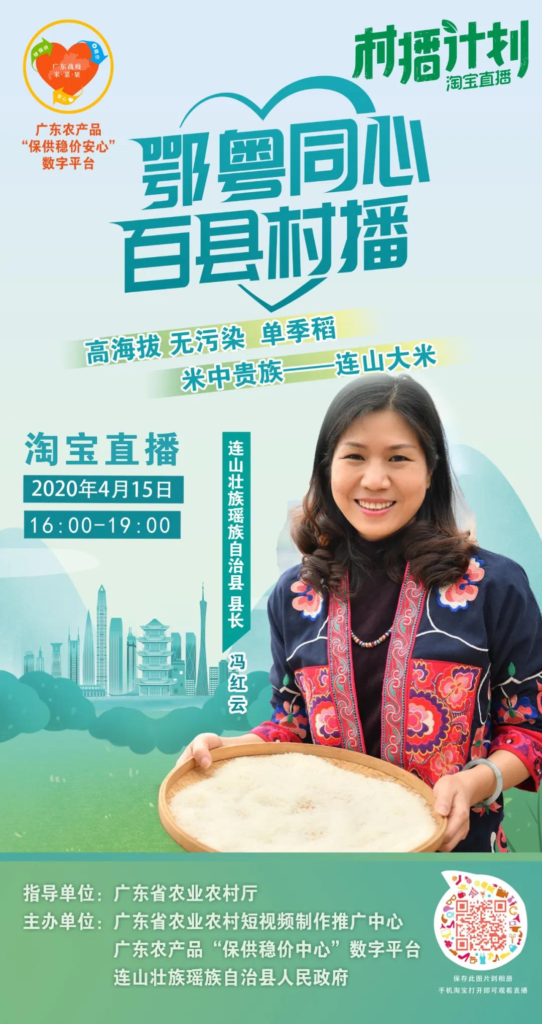 为促进鄂粤两省特色优质农产品线上销售,在中央指导组物资保障组、农业农村部的统筹安排下,广东、湖北两省签署合作协议,决定在4月15日淘宝村播日举办鄂粤同心、百县村播活动。连山县积极参与直播活动,届时连山的大米、姜茶等特色产品和湖北小龙虾将一起在淘宝直播间亮相。