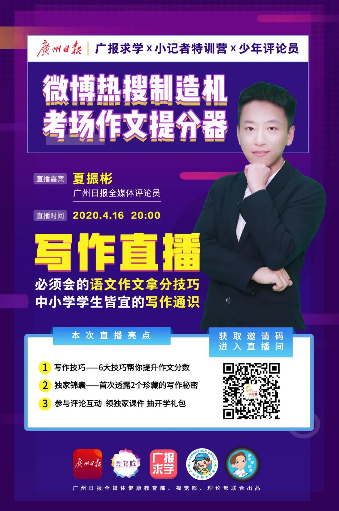 这次我们邀请了写出微博热搜话题第一的广州日报金牌评论员夏振彬老师,为大家直播分享写作过程中常用的“六大技巧”,助力同学们们写出高分作文!
