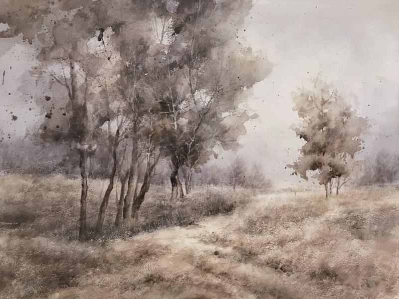 最开始的时候,蒋正杨只是回归湖湘写生,尤其喜爱画建筑和风景。她选取的可绘画的事物多样,有时是一条小路、一棵古树、一座老屋,有时是成片的寨子、远山大河和风拂过的山谷。不知不觉中,这些“眼前的建筑和风景成了符号和意向,不由自主的在画面中越走越远,越来越浅,常常还蒙上一层薄薄的灰色调,就像原野上天空中的雾岚。”这时,她才明白这种浅淡的灰色就是她心中的乡愁。于是,她越创作越有感悟,那些依山成村,临水成院的安宁家园,便是记忆中故乡真确的模样。也正是将这些柔和而平静的意境渗透进画中,组合出她印象中的远方。