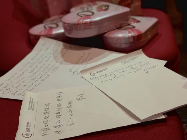 “这些是离开酒店的旅客留下的礼物”,张洪斌指着几封手写信和巧克力说,最满足的事是密接旅客无恙结束14天医学观察离店。在越秀区文广旅体局二级调研员谭宇明的带领下,张洪斌、潘舜等六人加入了越秀区防控新冠肺炎境外人员转运服务专班,驻扎在密切接触者医学观察酒店。入住的客人都是确诊病例的密切接触者,工作有一定的风险。为做到“严防而不失温暖”,谭宇明认真、细致统筹,大家分工合作,丝毫不敢马虎。潘舜主要负责协调解决突发性问题;包瑞强负责物资保障工作;欧昊负责消毒、内务等。