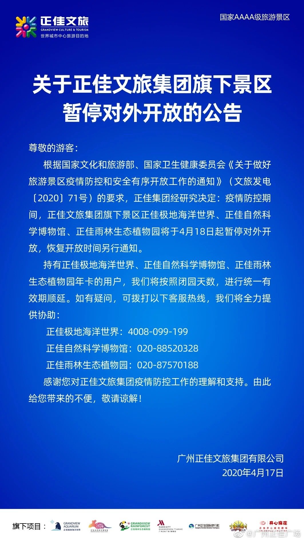 根据国家文化和旅游部、国家卫生健康委员会《关于做好旅游景区疫情防控和安全有序开放工作的通知》(文旅发电2020]71号)的要求,正佳集团经研究决定:疫情防控期间,正佳文旅集团旗下景区正佳极地海洋世界、正佳自然科学博物馆、正佳雨林生态植物园将于4月18日起暂停对外开放,恢复开放时间另行通知。
