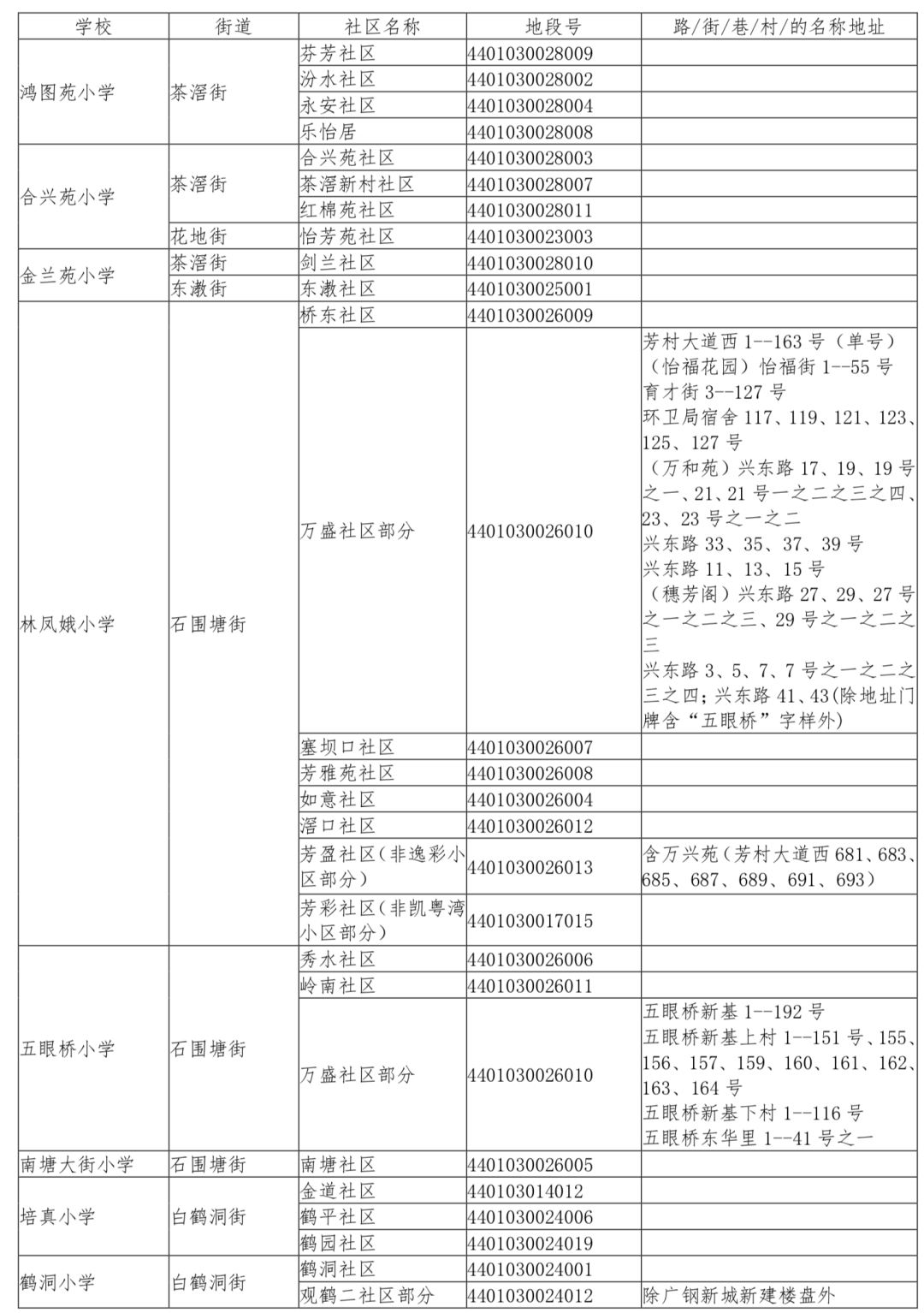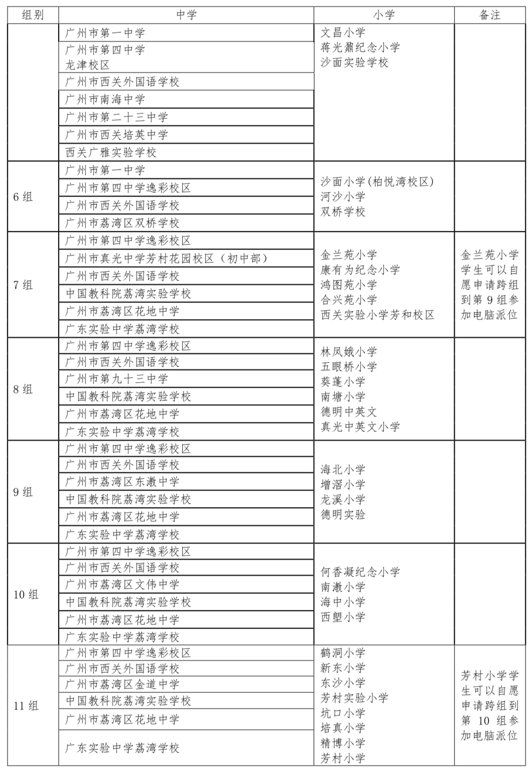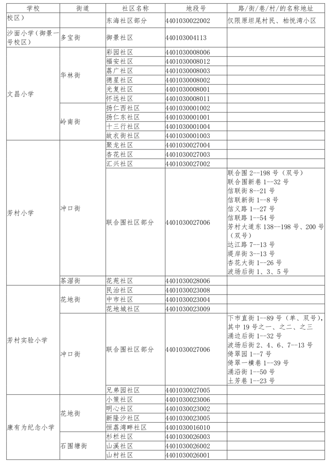 华南师范附属荔湾学校招生细则中写到,在2020年5月27日前,完成地段生任务后的剩余学位以电脑派位的方式,招录未能获得广东实验中学荔湾学校入读学位的“人户一致”适龄儿童。除了广钢新城以外,荔湾区其它区域“幼升小”具体地段如下: