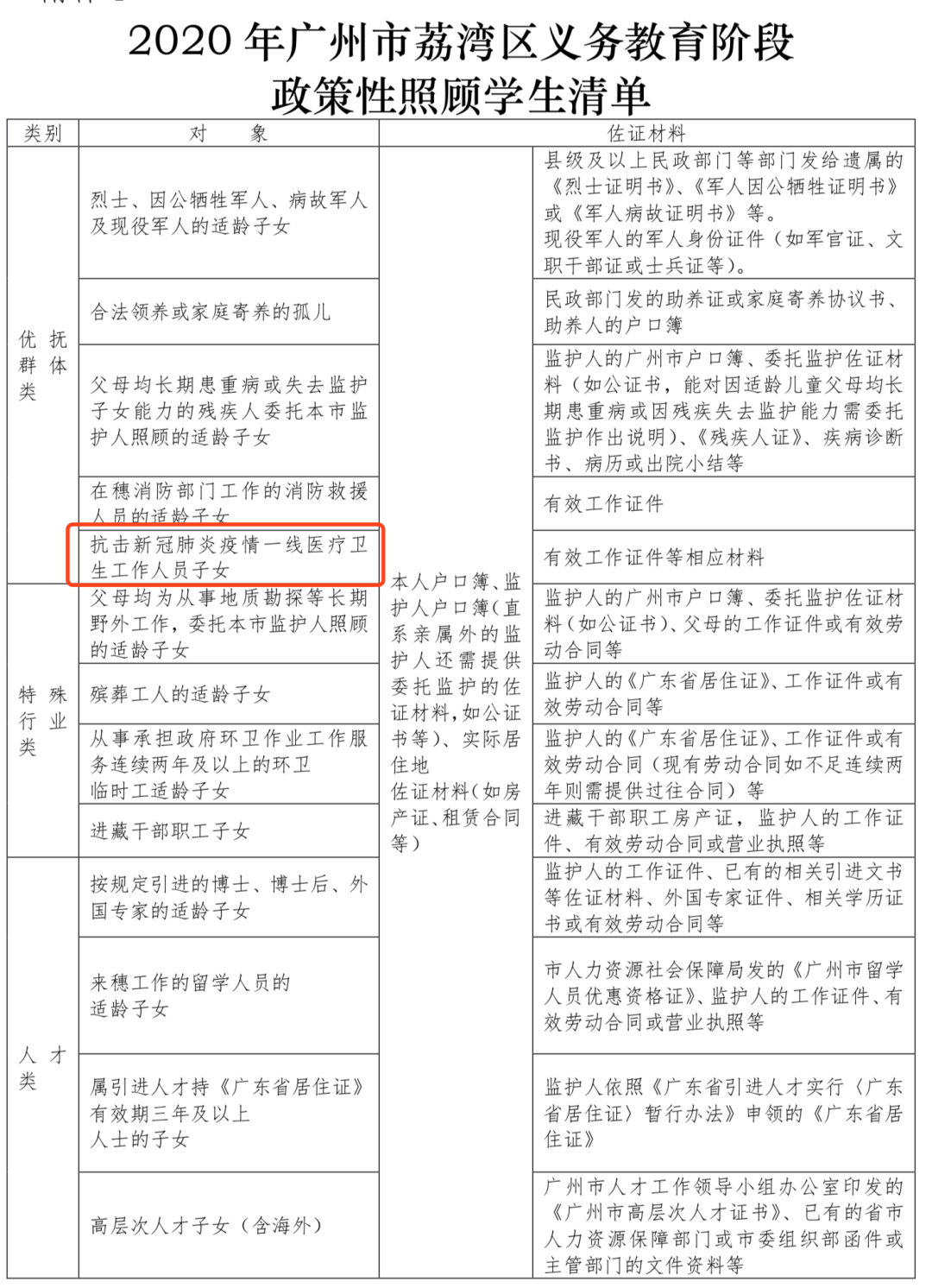 今年荔湾区的义务教育阶段政策性照顾学生清单中增加了抗击新冠肺炎疫情一线医疗卫生工作人员子女一项。符合政策性照顾学生条件,并经审核公示的政策性照顾学生,能提供其实际居住地的房产证或购房发票和购房协议、或持住建部门认可的唯一房屋租赁合同(须为住宅用途房屋)及登记备案证明依据的小学入学适龄儿童可以适用对口入学政策。而符合政策性照顾的外市户籍小学毕业生则可以参加荔湾区小升初招生。