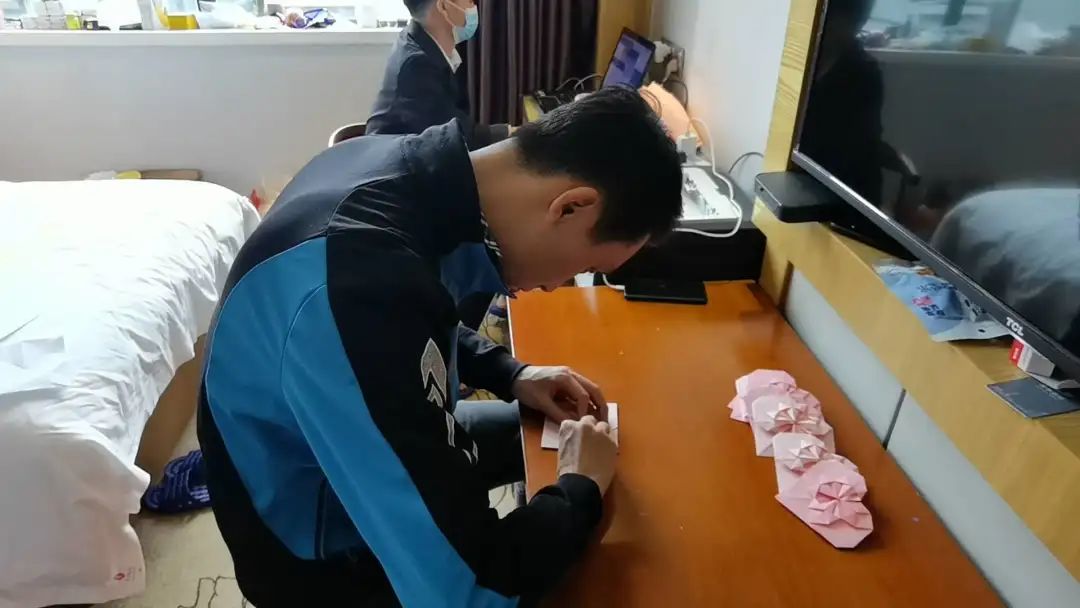 工作人员认真折好写着诗歌的“爱心”