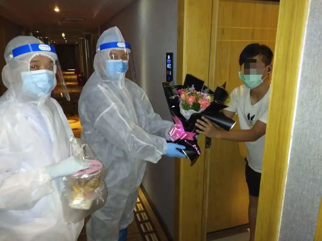 慰问活动当天,利用给隔离人员进行健康监测的时机,张淇沨和负责集中医学观察酒店管理的区政务数据局副局长陈粤晖一起,两人穿上厚厚的防护服,分别来到8名住客的房间门口,逐个为他们送上了生日大礼包。