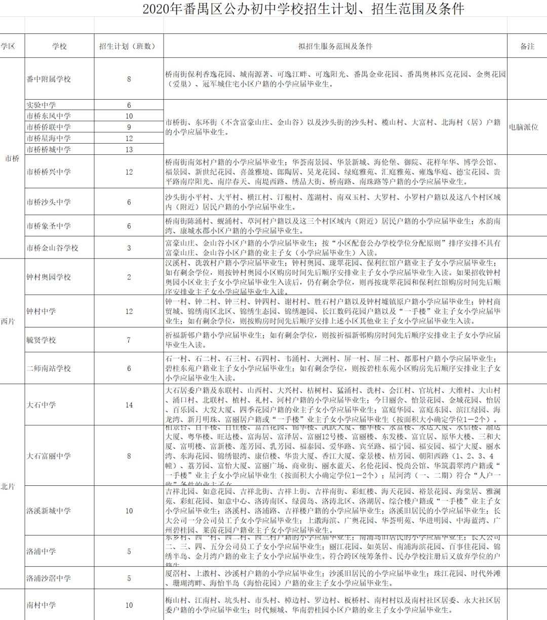 义务教育初中阶段,今年与去年变化不大。实验中学、市桥东风中学、市桥侨联中学、市桥星海中学、市桥桥城中学、广铁一中位于亚运城的三个校区需要电脑派位之外,其余学校,招生政策与往年变化不大,均为招收周边居民户籍应届毕业生。
