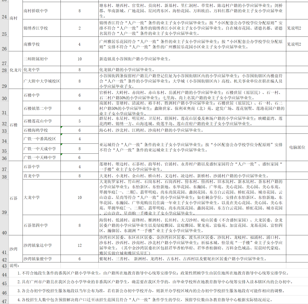 小学招生方面,今年番禺区学位比去年有一定数量的增加,虽然只增加了南站小学,沙头中心小学两所学校,但是总体来说比去年多招生154个班。而初中则比去年招生少了2个班。