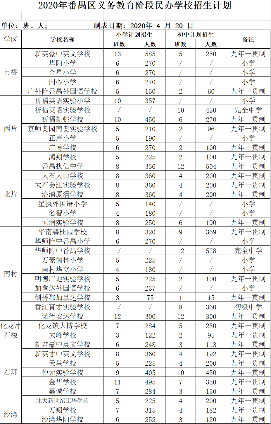 番禺区2020年义务教育阶段学校招生工作细则公布!4月20日,番禺区公布了2020年义务教育阶段学校招生计划、招生地段及条件。据记者统计,今年义务教育小学总共招生487个班,初中招生269个班。民办学校招生比去年增加177人。