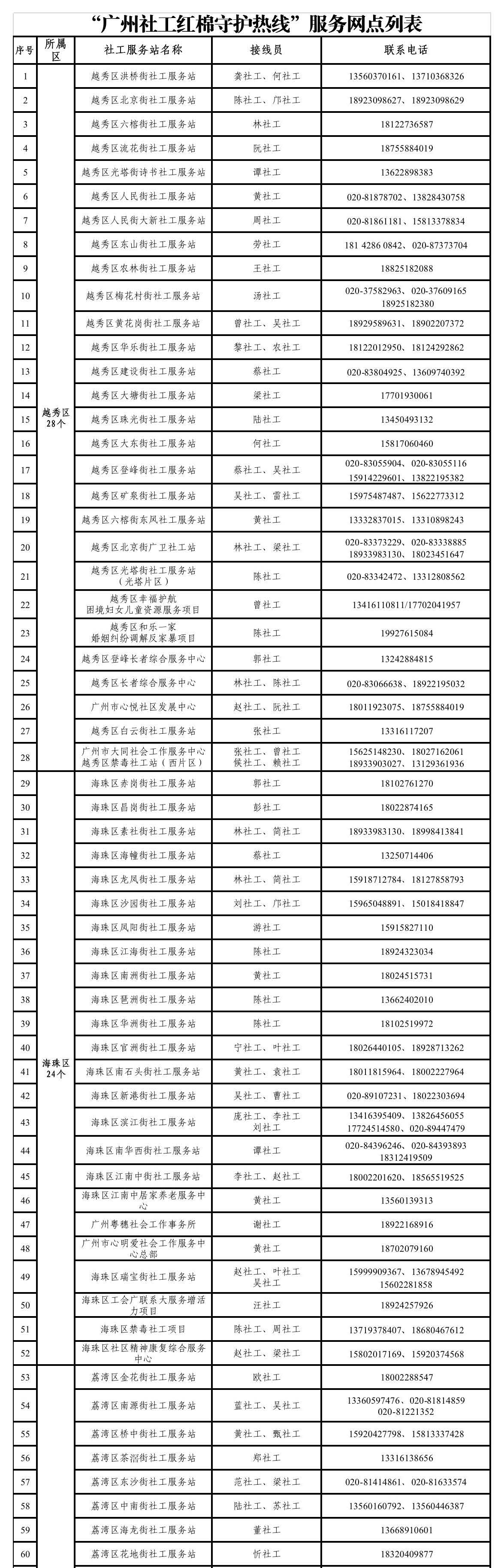 答:在广州市民政局的指导下,广州市社会工作协会于1月26日发出了《关于全行业援助抗击新冠肺炎疫灾,实施“广州社工红棉守护行动”的倡议书》,全市开设超过200条“广州社工红棉守护热线”,居民通过拨打所属街区红棉守护热点电话,即可获得社工服务,服务内容包含但不限于:健康码申请疑难解答、疫情讯息咨询、生活困难帮扶、情绪疏导等。