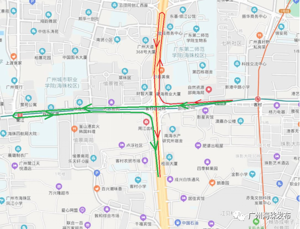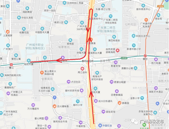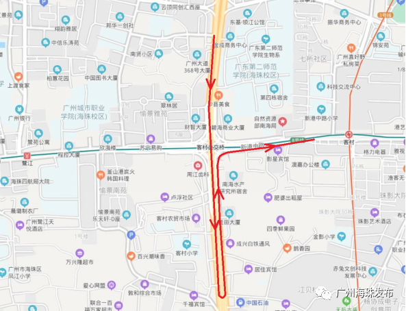 04 新港路西往北方向行驶车辆可行驶至新港中路艺苑路处掉头绕行,也可以行驶往广州大道南方向海珠交警大队对出路口处掉头绕行;