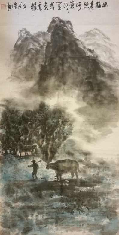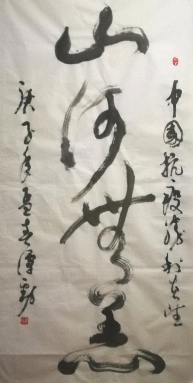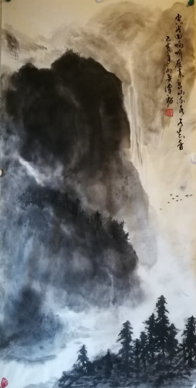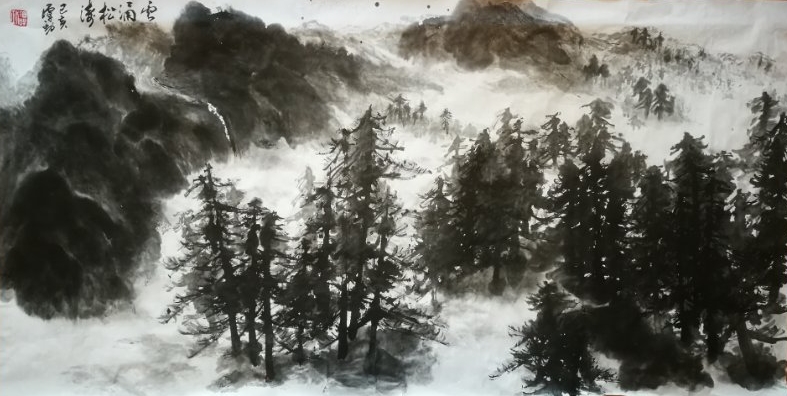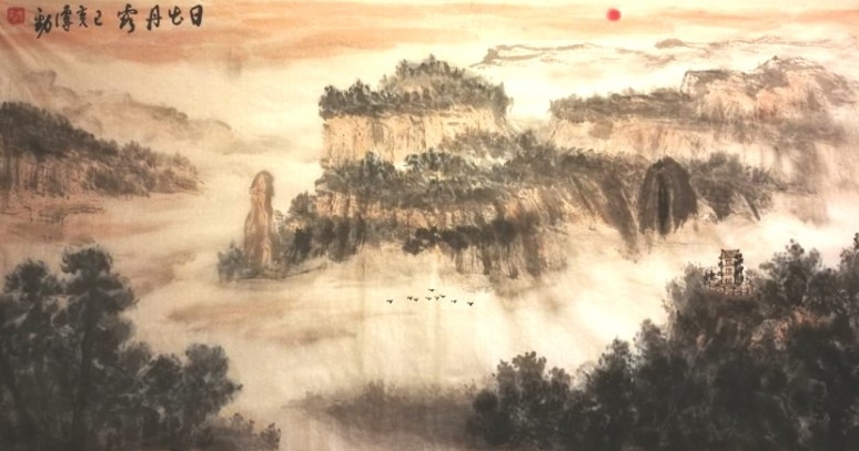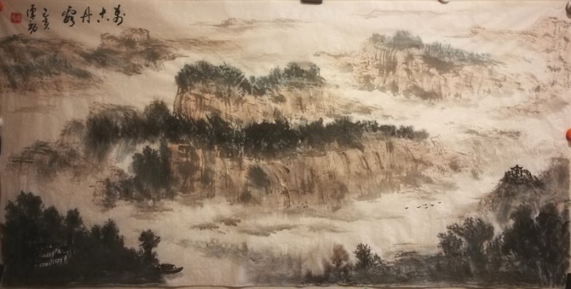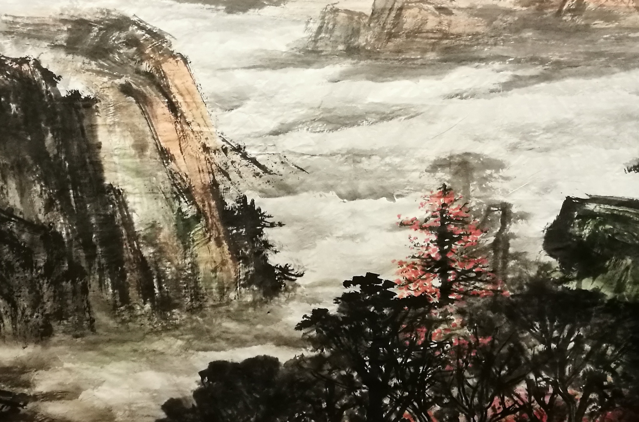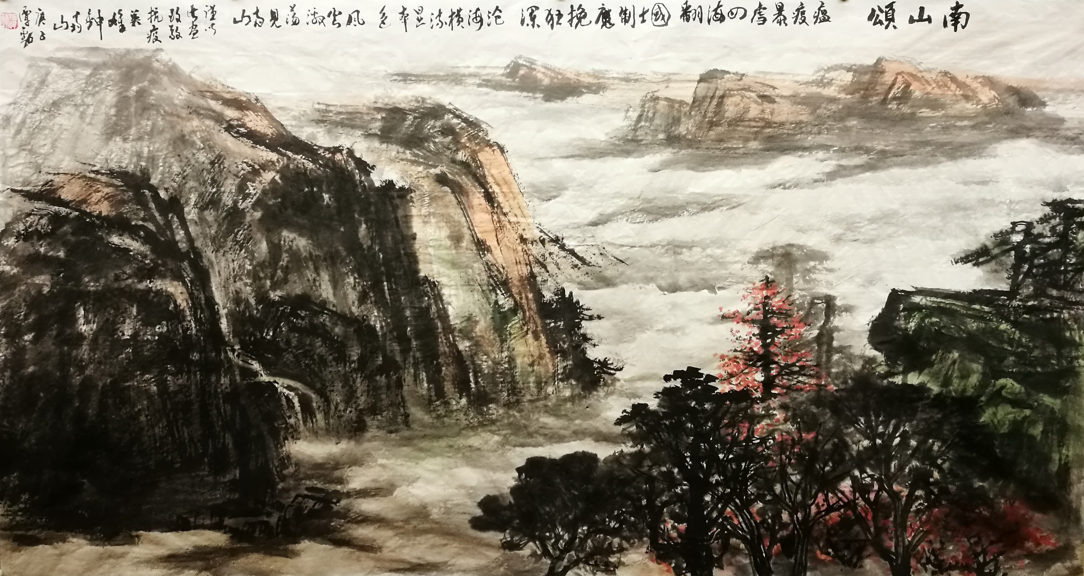 我们再来看这幅《南山颂》,就不仅可以看到沧海横流、风云激荡、雨雾交织的画面,而且还可以看到巍峨南山、红棉花开、负山戴岳的构图,而我更是从“上医医国”的角度看到了“为天地立心,为生民立命,为往圣继绝学,为万世开太平”的南山品格、南山气质、南山精神!