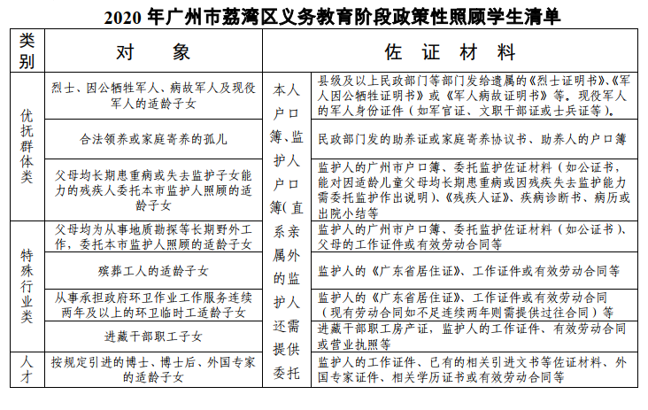 五、符合2020年广州市荔湾区义务教育阶段政策性照顾学生条件,并经审核公示的政策性照顾学生,能提供其实际居住地的房产证或购房发票和购房协议、或持住建部门认可的唯一居住地房屋租赁合同(须为住宅用途房屋)及登记备案证明的,以实际居住地为依据,按区教育局安排对应地段的学校对口入学。