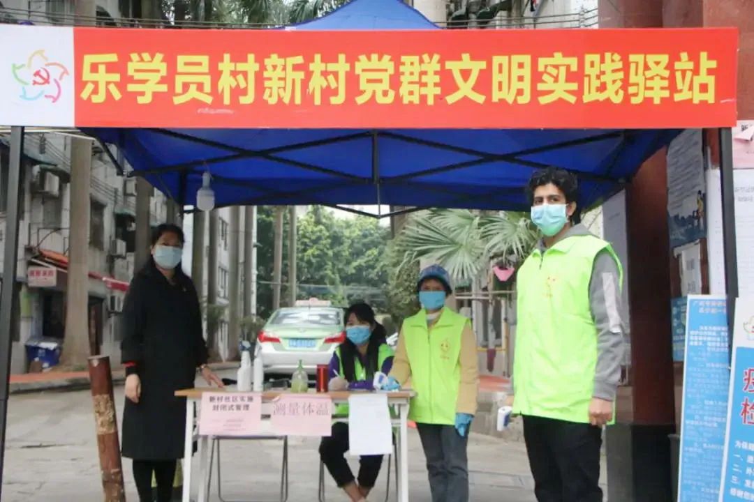 志愿者在测温岗值守,右一是来自也门的HELMY。