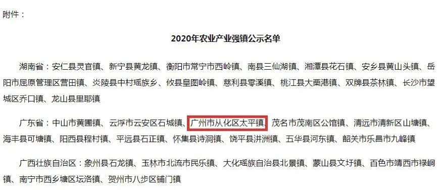 近日,国家农业农村部、财政部联合发布《2020年农业产业强镇建设公示公告》。其中,广东省12个乡镇榜上有名,广州从化太平镇以荔枝主导产业优势入选。