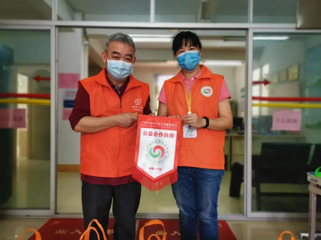 广州大同社工服务中心部长李洁雯向齐志社工服务中心理事长李晓辉赠送合作锦旗。