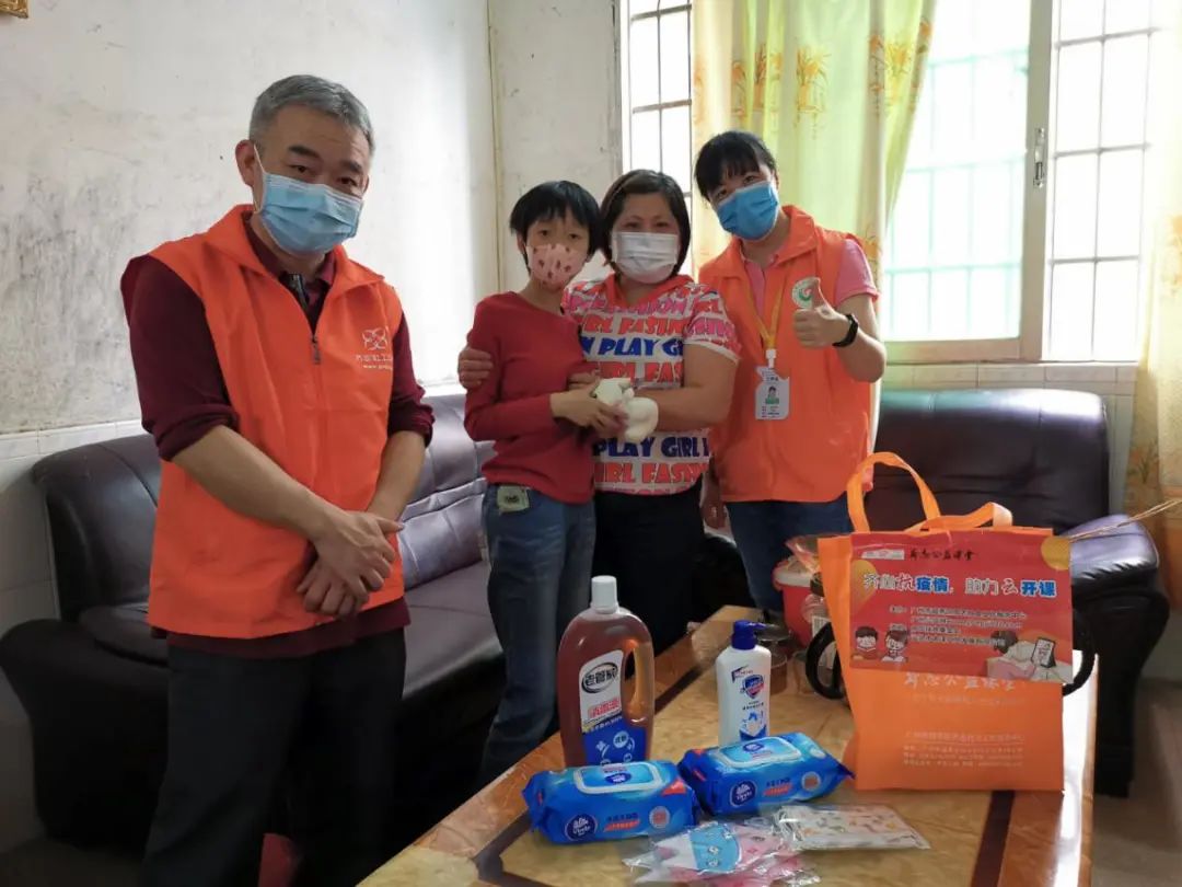 在本次活动中,广州大同社工和齐志社工为困境儿童们送去防疫包,并详细说明了防疫包中洗手液、消毒水、儿童口罩等防疫物件的使用方法。