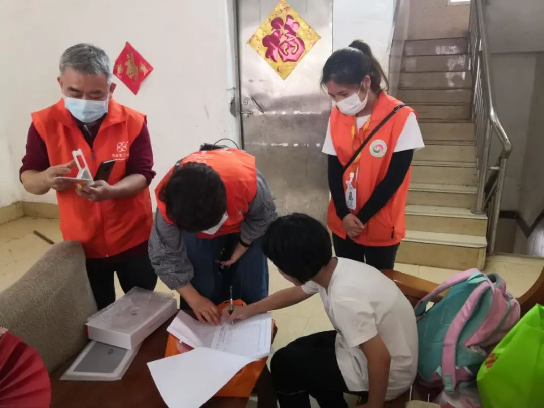 社工为困境儿童家庭派发爱心防疫包、儿童卡通口罩和公仔等物资。通过前期排查,海龙街社工发现有一户困境家庭因为手机设备老旧,导致孩子没法正常上网课,为此,街道社工主动链接齐志社工服务中心的社工,成功为该名困境儿童申请了平板电脑。4月21日下午,社工们一起将一台崭新的平板电脑送给该名儿童,并深入了解其家庭生活情况和学习情况,教孩子如何使用平板进行学习,鼓励其积极乐观、努力学习。