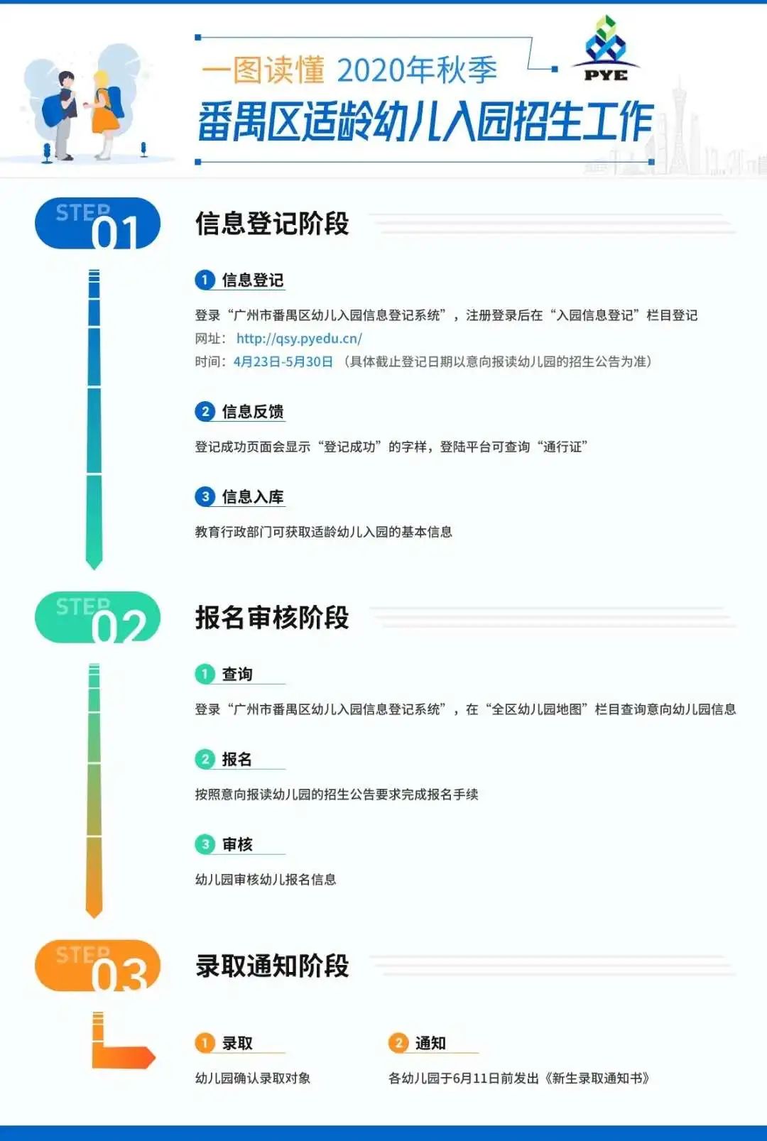 4月23日上午10点起,石楼镇适龄幼儿需进入“广州市番禺区适龄幼儿入园信息登记系统”进行登记。只有通过登记并取得《通行证》的幼儿,在入园后才能取得完整的学前教育学籍。