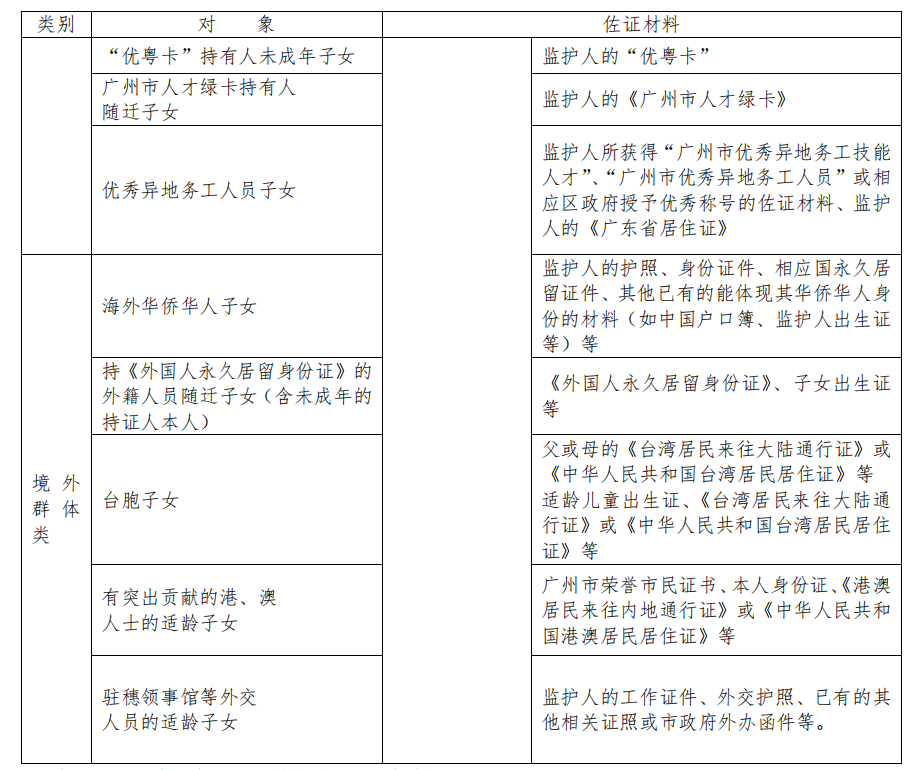 3. 符合2020年广州市荔湾区义务教育阶段政策性照顾学生条件适龄儿童(具体内容见下图),以实际居住地为依据,5 月 18 日到实际居住地对应地段学校提交材料报名并审核。