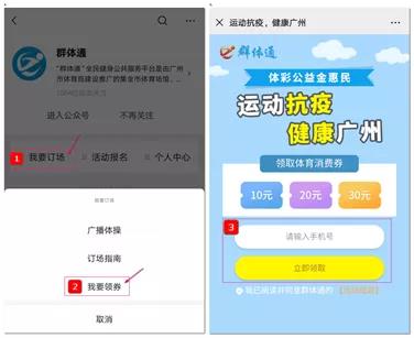 一、进入“群体通”微信公众号,依次点击菜单栏“我要订场”→“我要领券”,进入页面并输入手机号,领取运动优惠大礼包1份,内含10、20及30元运动优惠券各1张;