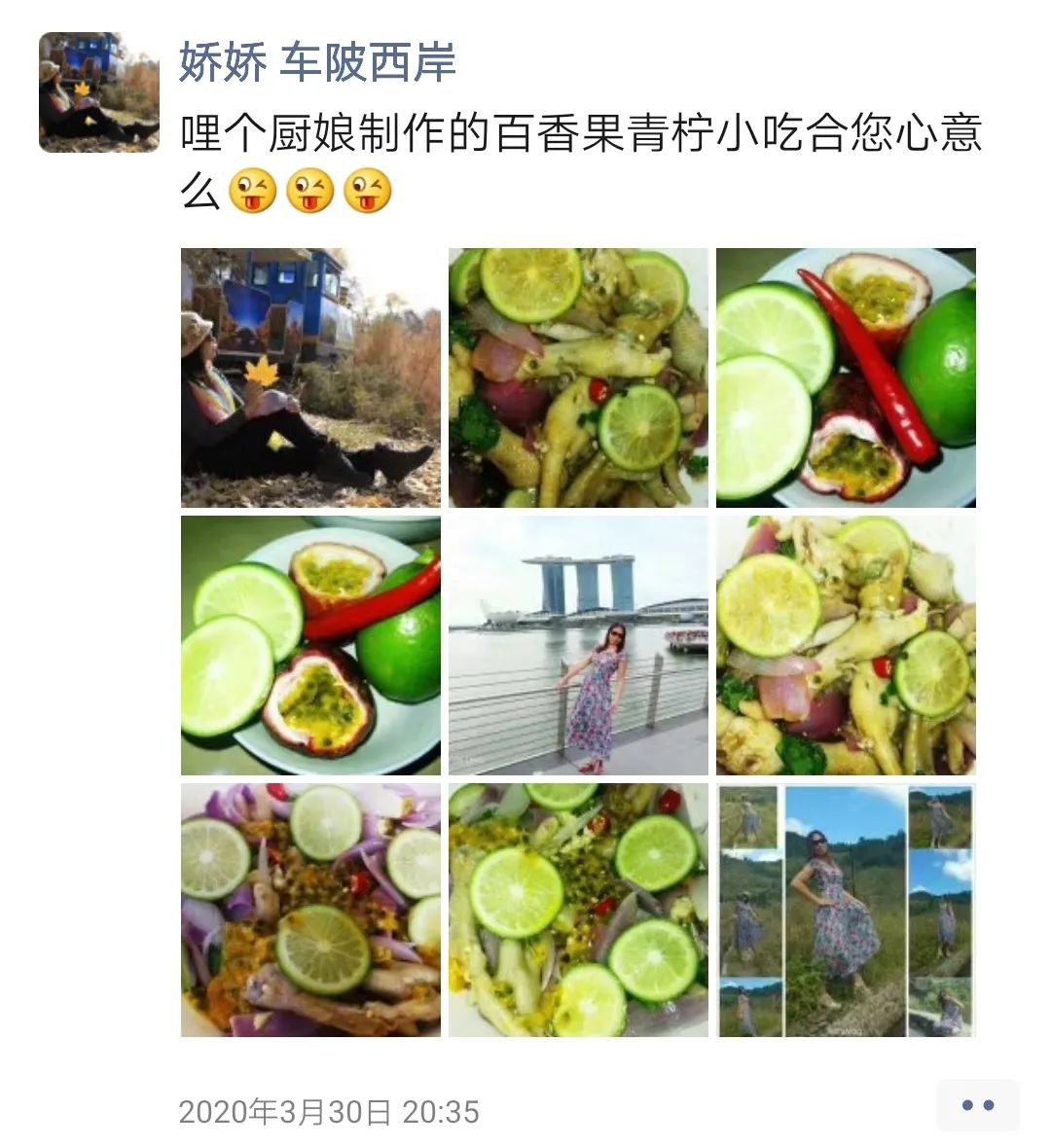 娇娇喜欢用青柠檬制作各种百香果青柠凤爪等小吃。娇娇说,她喜欢各种咸柠檬、蜜糖柠檬、柠檬片等纯手工制作的东东,还经常帮朋友们制作咸柠檬。